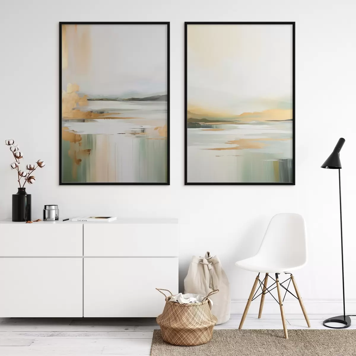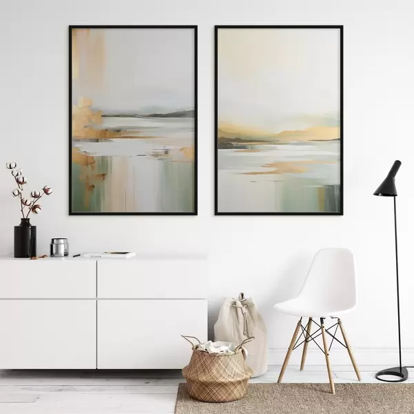 Poster Paysage abstrait aux tons jaunes et verts, eau reflétant le ciel et les montagnes lointaines, ciel pâle et brumeux Nr d01245