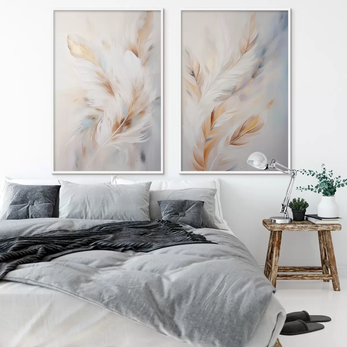 Poster Grandes plumes douces aux teintes blanches, jaunes et brunes, sur un fond clair et abstrait. Nr d01247