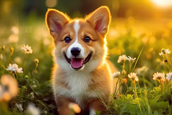 Poster Chiot Corgi dans les fleurs sauvages f33532