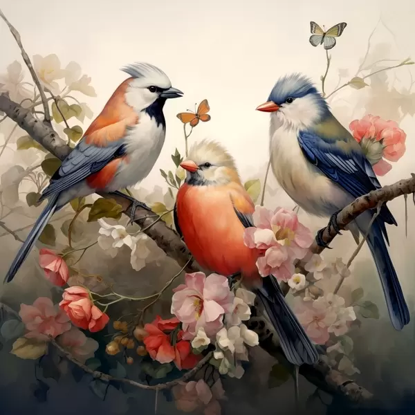 Poster Groupe d'oiseaux sur une branche avec des fleurs f38103
