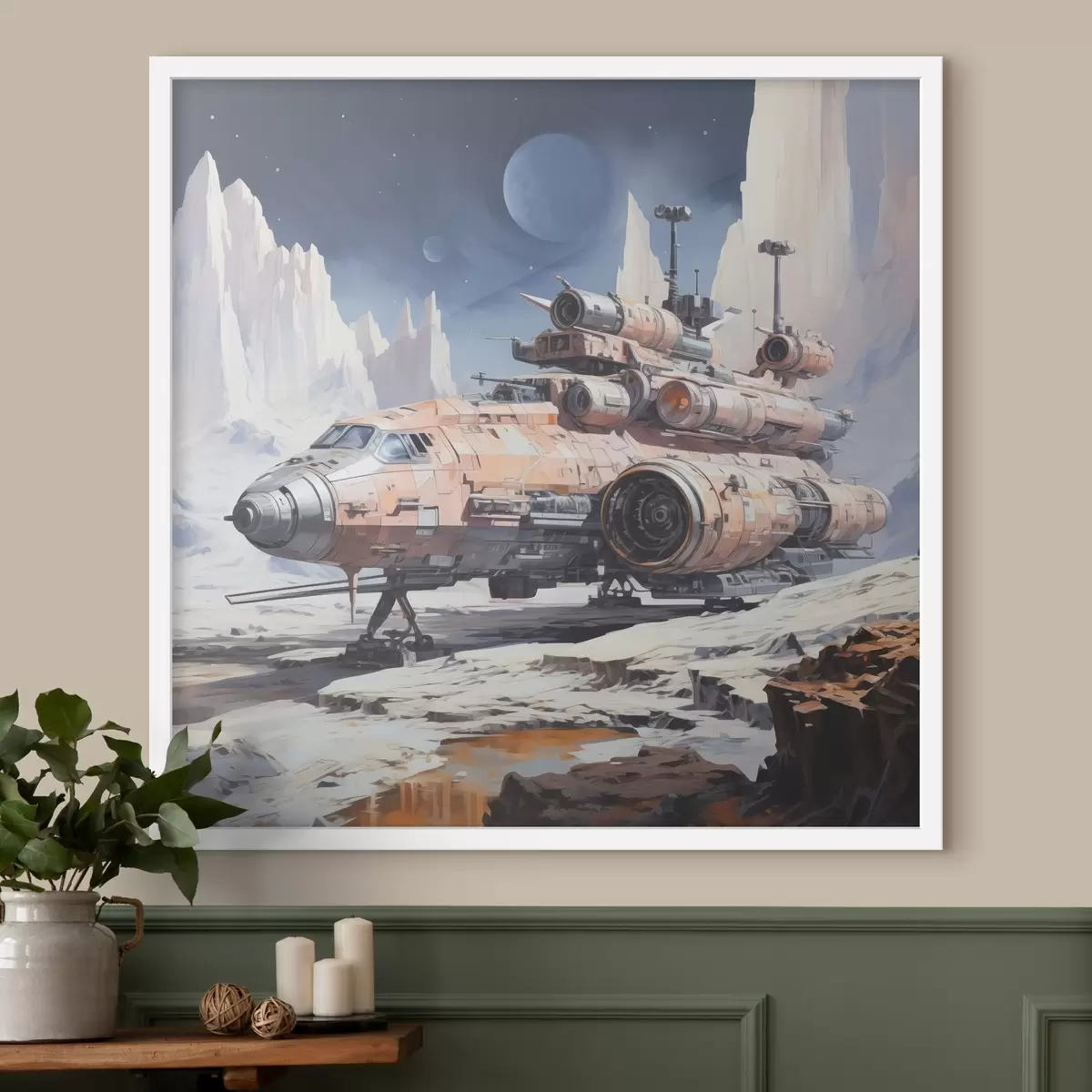 Poster Un vaisseau spatial de style cyberpunk se tient sur la surface de la lune dans l'espace parmi les montagnes, les couleurs bleu, beige et blanc Nr f39114