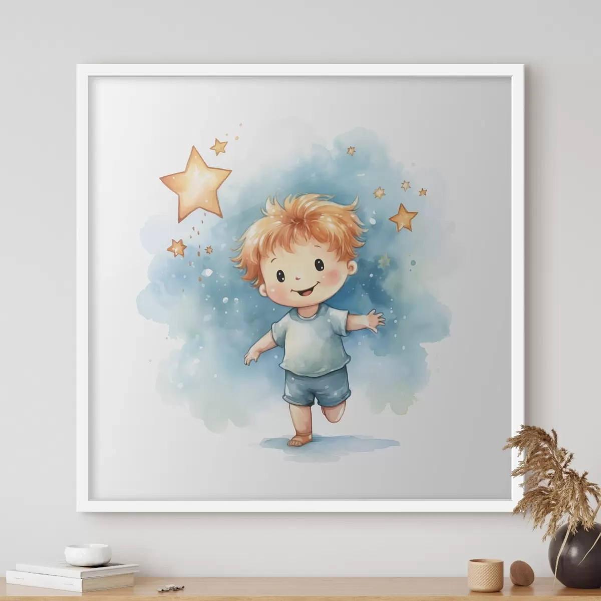 Poster Un garçon aux cheveux roux dans un costume bleu court après les étoiles, illustration aquarelle pour enfants Nr f39118