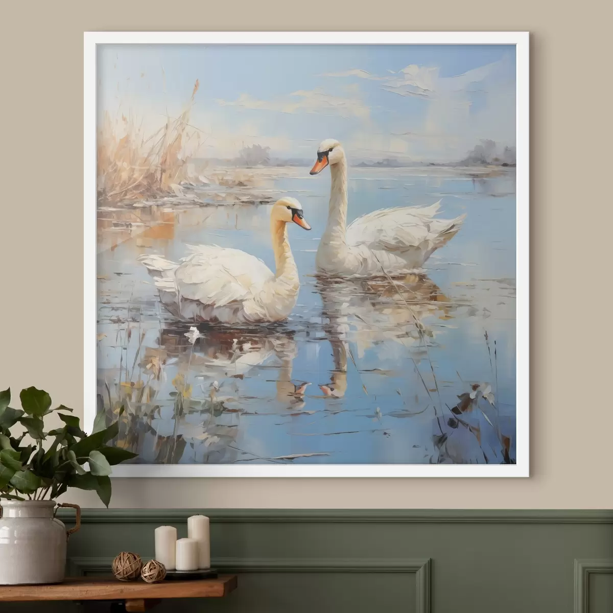 Poster Les oies blanches nagent le long de la rivière parmi les roseaux, bleu, blanc, beige Nr f39130