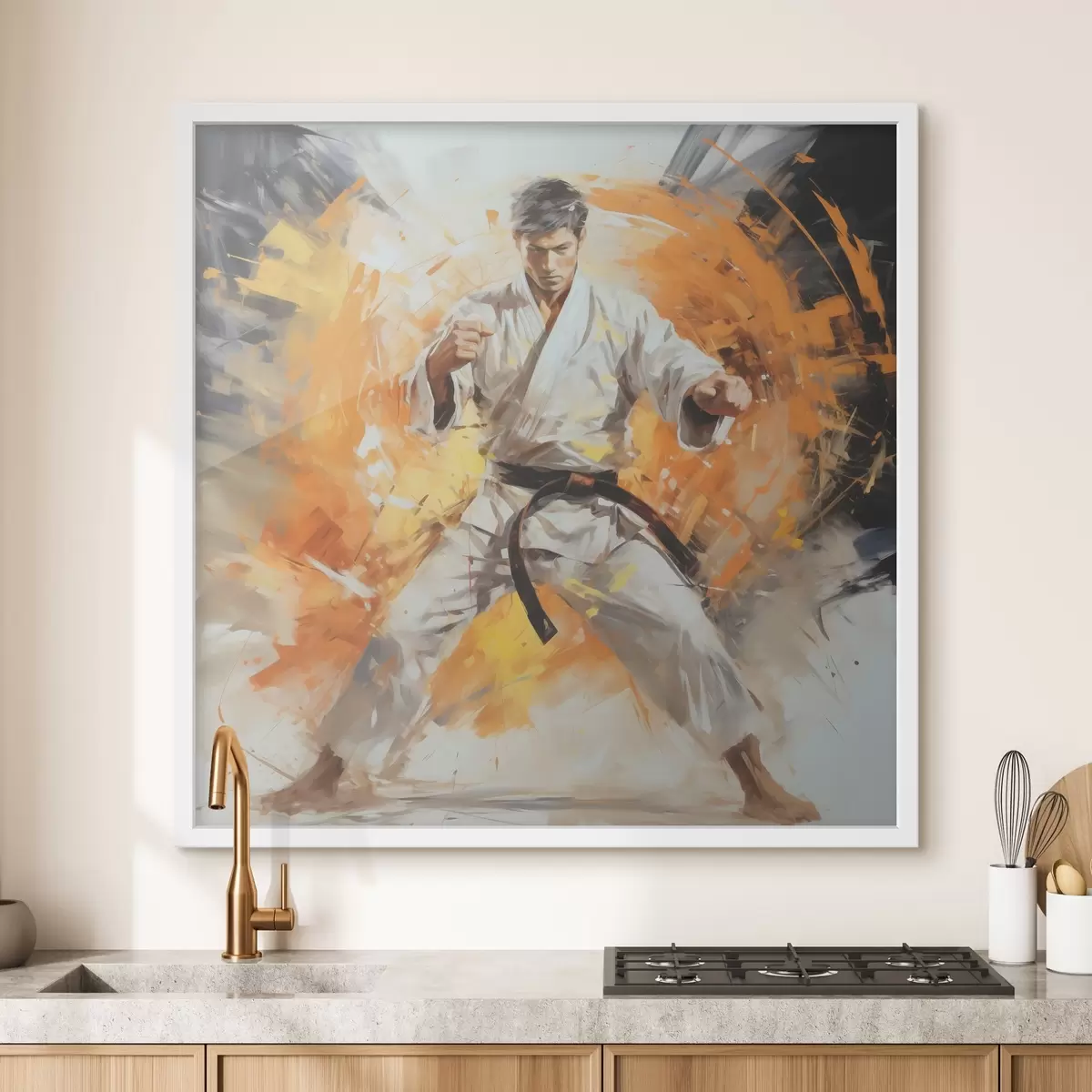 Poster Karateka dans un costume blanc avec une peinture à l'huile de ceinture noire art abstrait, couleur orange et noire Nr f39185