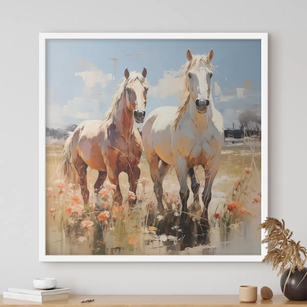 Poster Des chevaux blancs et bruns broutent dans un pré parmi des fleurs sauvages, peinture à l'huile, art abstrait Nr f39187