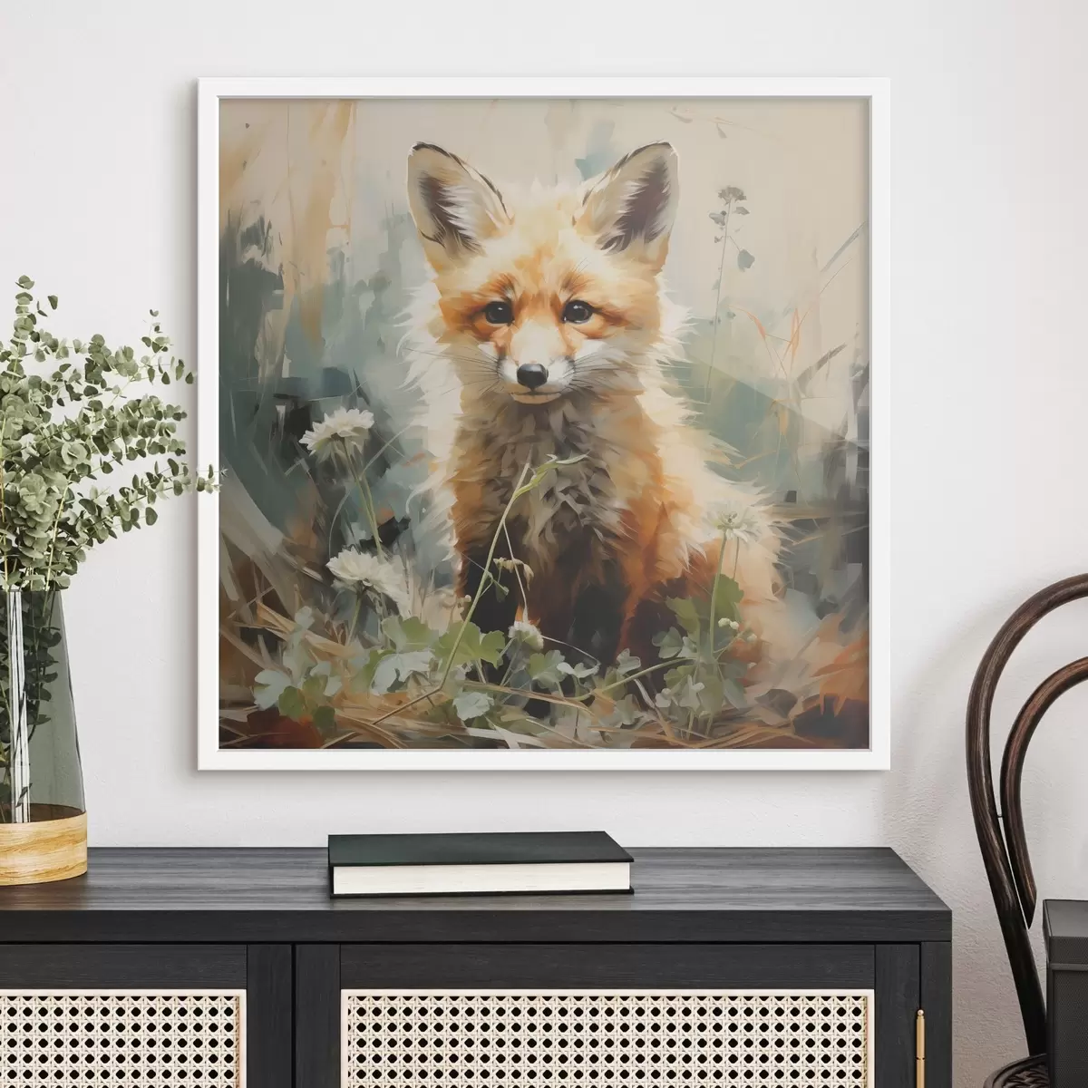 Poster Renard roux assis dans l'herbe sèche sur fond vert. Peinture à l'huile Nr f39191
