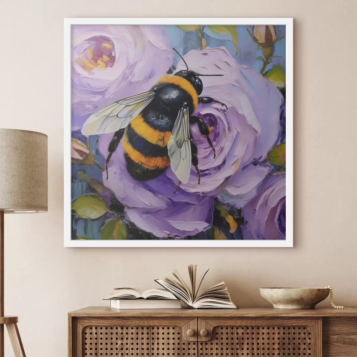 Poster Abeille sur pivoines roses, fleurs d'été, peinture à l'huile, coups de pinceau vifs Nr f39410