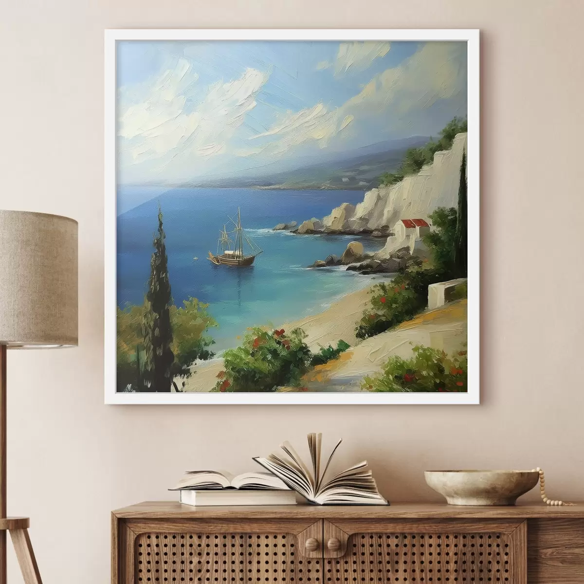 Poster Côte maritime de Grèce, navire, eau bleue, peinture à l'huile, nature estivale, rochers, coups de pinceau vifs Nr f39425