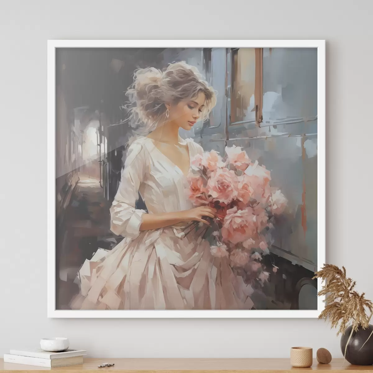 Poster Une jeune fille en robe blanche à la gare tient un bouquet de roses roses dans ses mains, peinture à l'huile Nr f39438