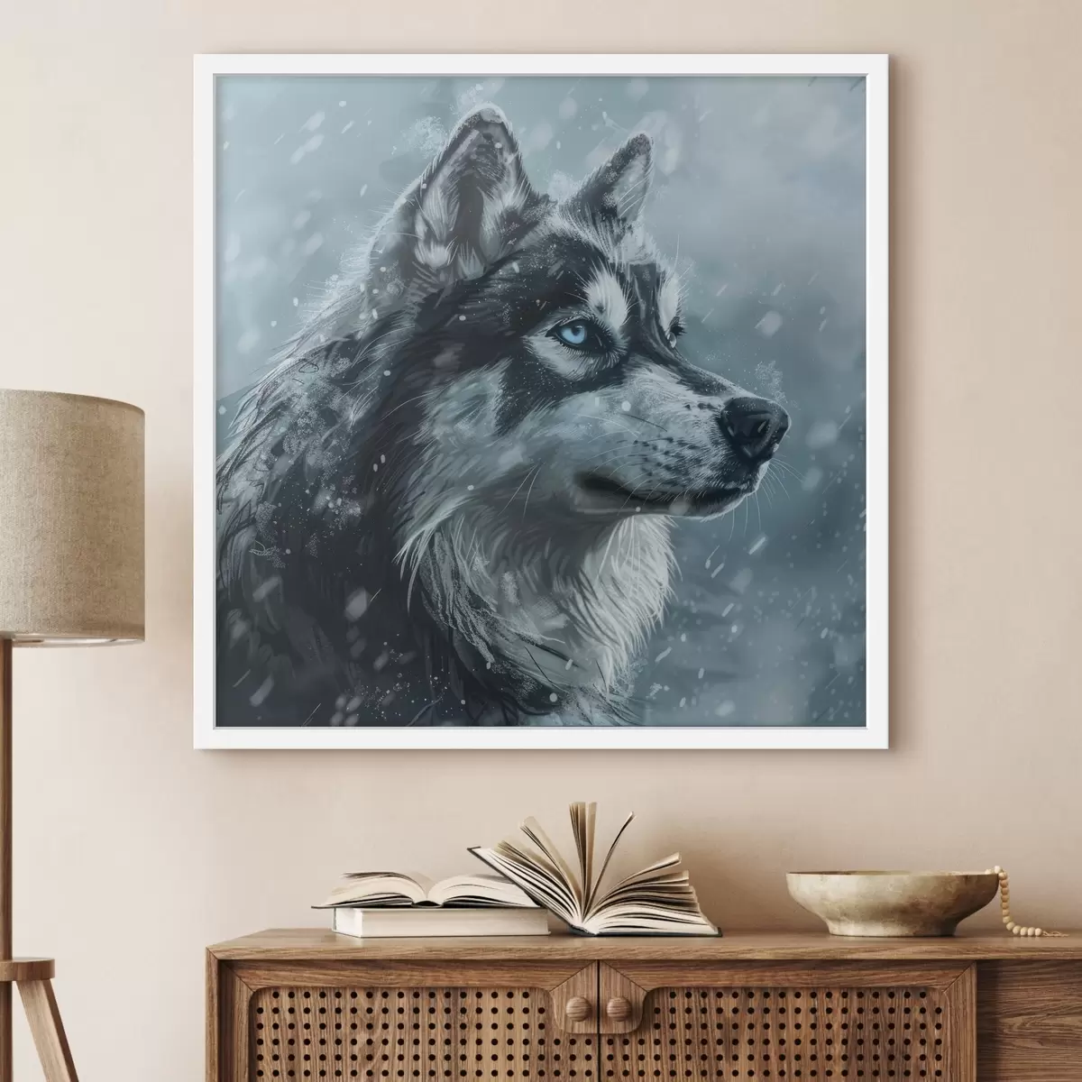Poster Husky aux yeux bleus sur fond bleu hivernal f39462