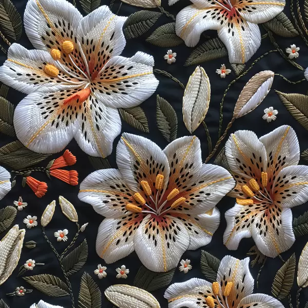 Poster Broderie de stumpwork : lys en fleurs en fil noir sur tissu orné avec des œuvres d'art détaillées Nr f39650