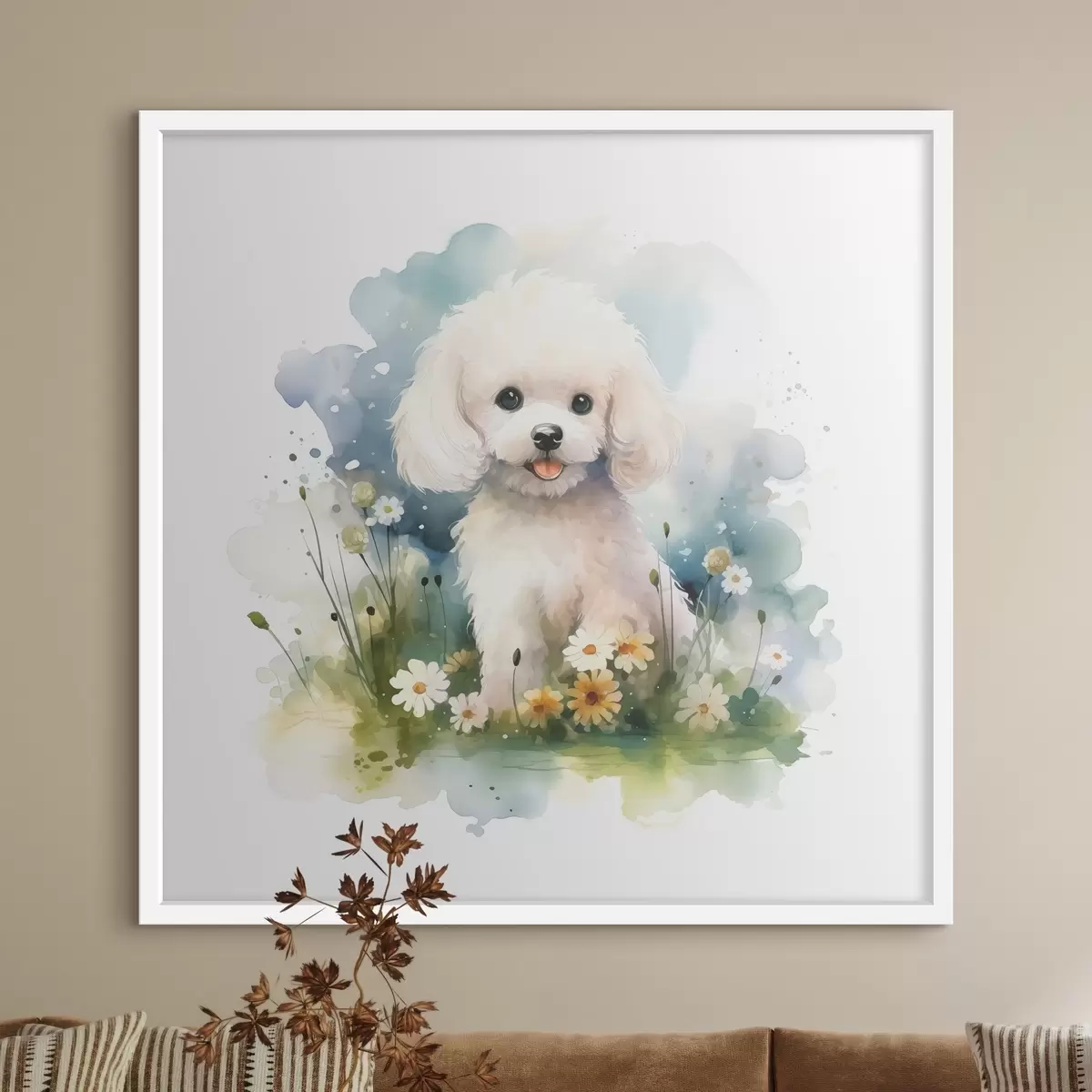 Poster Petit caniche blanc assis dans une aquarelle de fleurs Nr f39928