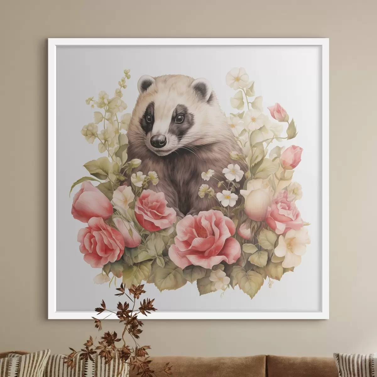 Poster Portrait d'un blaireau à l'aquarelle rose avec des roses anciennes f40094