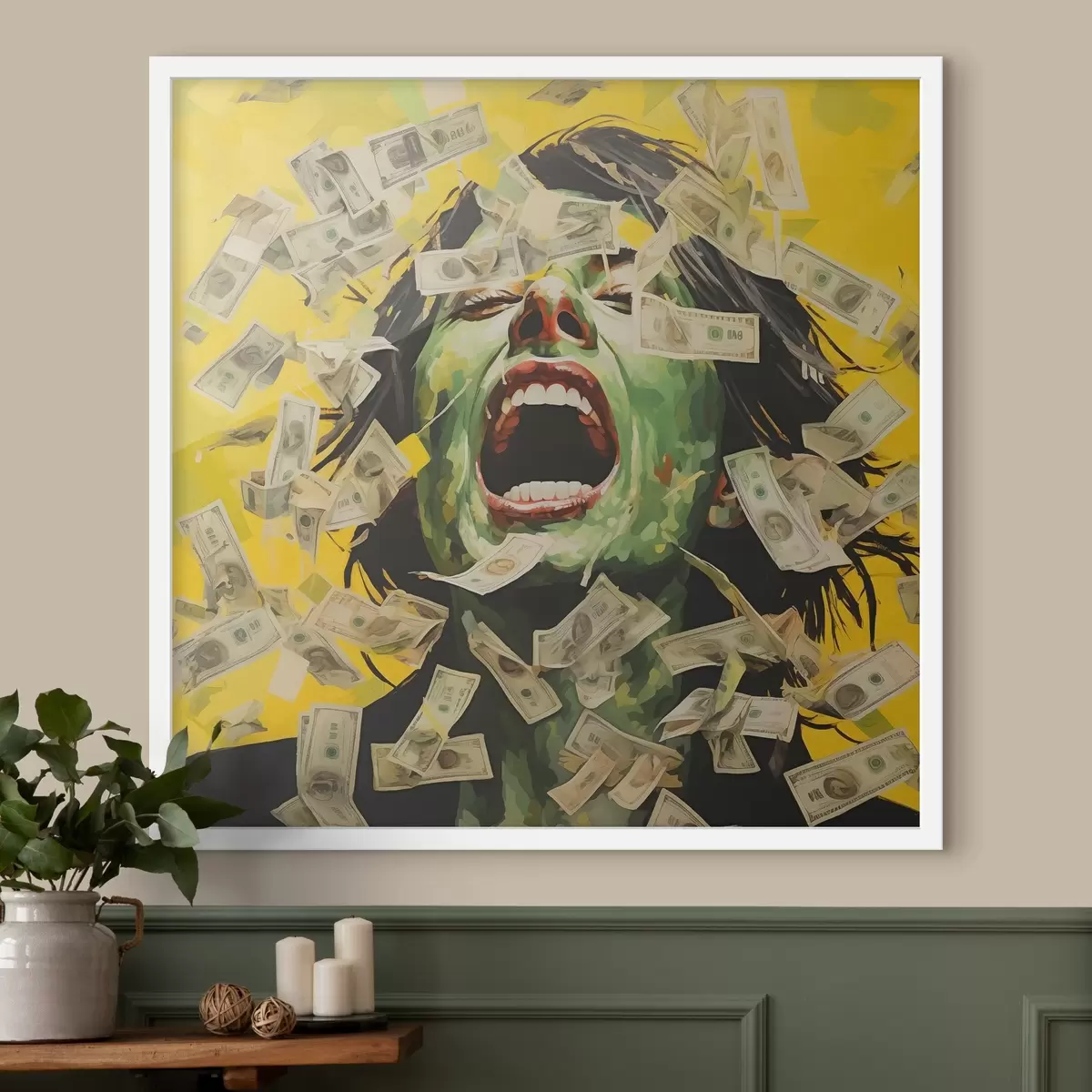 Poster Portrait d'une femme verte sur des billets de banque jaunes, criards, en papier, peinture à l'huile imitation argent Nr f40096