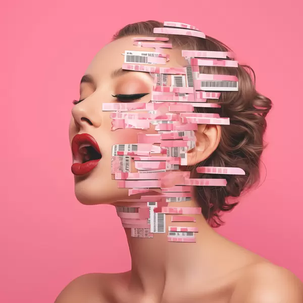 Poster Portrait d'une fille aux lèvres rouges couvertes de codes-barres sur fond rose Nr f40101