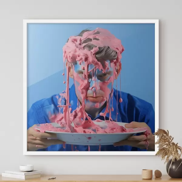 Poster Un homme sur fond bleu, vêtu d'une chemise bleue recouverte de peinture rose Nr f40102