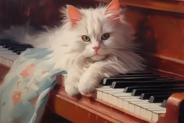 Poster Chat blanc couché sur les touches de piano imitation peinture f41853
