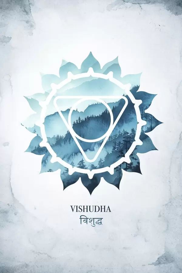 Poster Vishuddha chakra, chakra bleu, ésotérique, méditation, bouddhisme, montagnes style aquarelle f41884