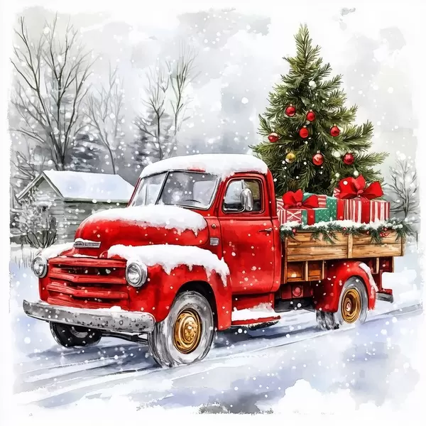 Poster Une voiture de Noël avec un sapin et des cadeaux par temps de neige Nr f41968