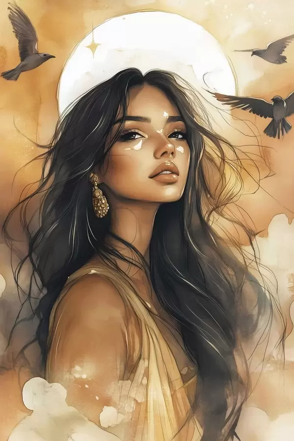 Poster Femme avec oiseaux volants, tribal, couleurs beiges, soleil Nr f42196