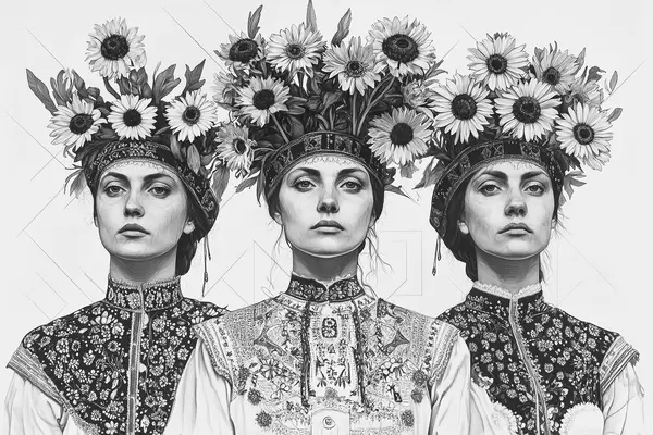 Poster Femmes ukrainiennes en tenues ethniques avec des couronnes de fleurs Nr f42379