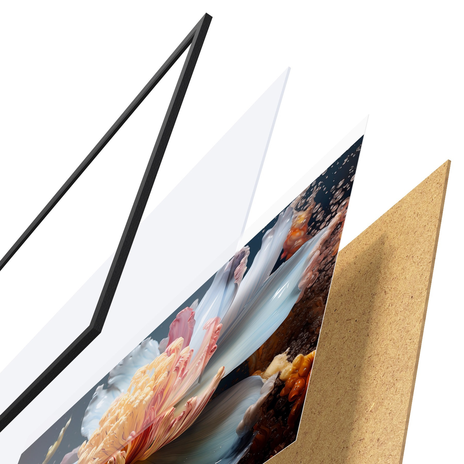 L’affiche encadrée est composée d’un cadre, d’un plexiglas, d’une image imprimée et d’un support en aggloméré. Elle est prête à être accrochée au mur grâce aux fixations situées à l’arrière.
