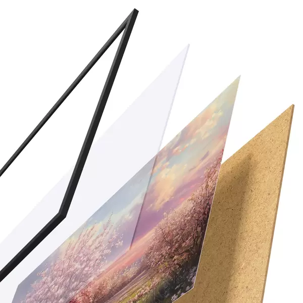 L’affiche encadrée est composée d’un cadre, d’un plexiglas, d’une image imprimée et d’un support en aggloméré. Elle est prête à être accrochée au mur grâce aux fixations situées à l’arrière.
