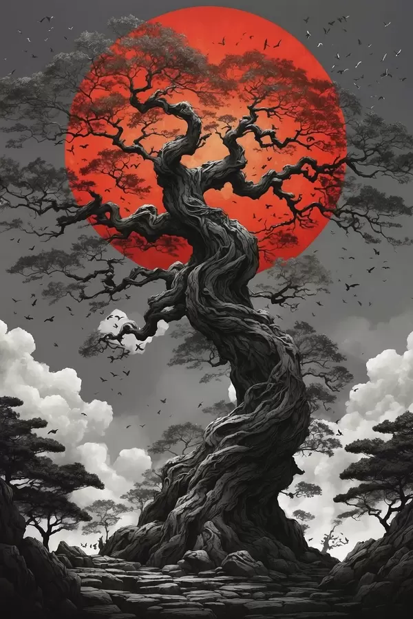 Poster Arbre et soleil rouge Nr f45485