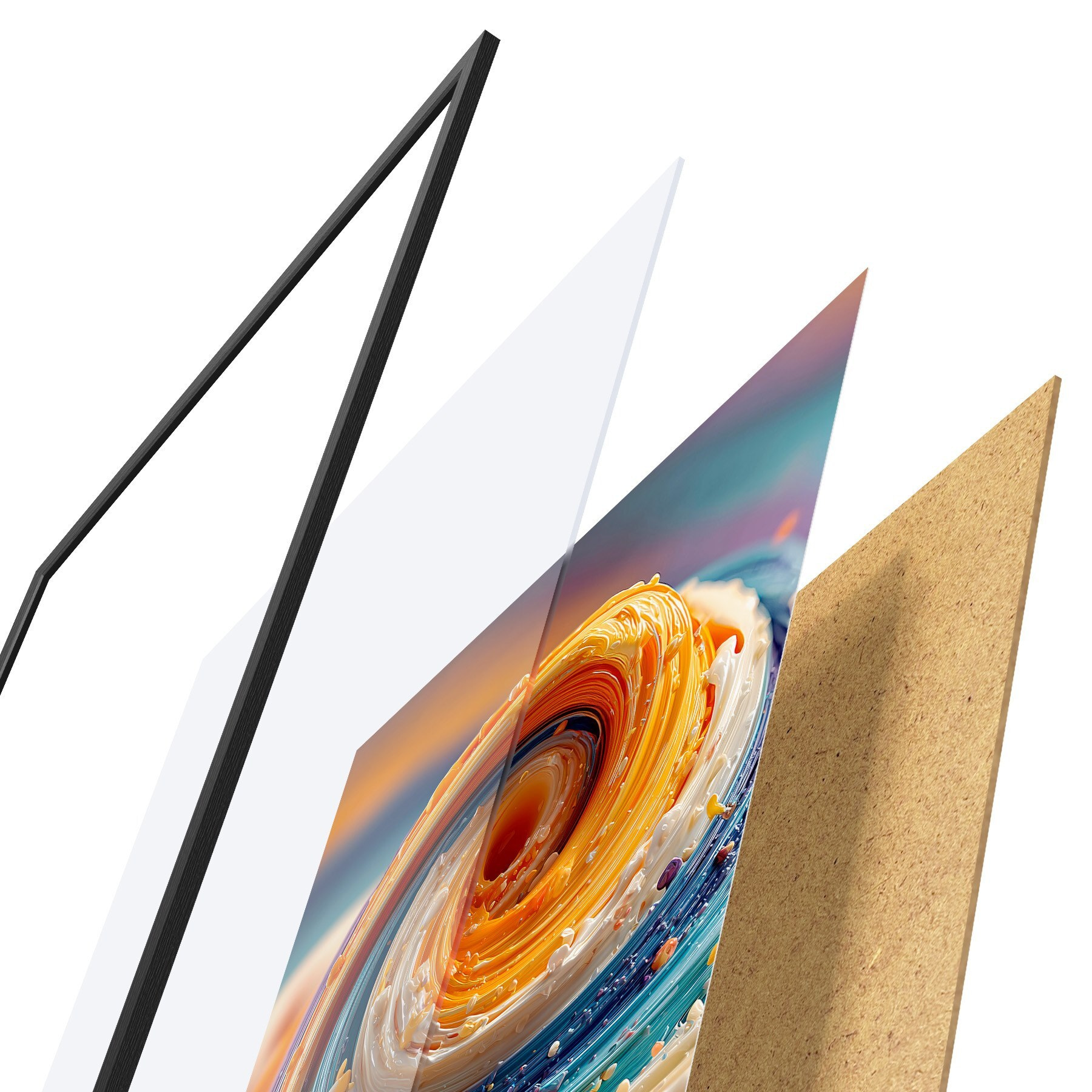 L’affiche encadrée est composée d’un cadre, d’un plexiglas, d’une image imprimée et d’un support en aggloméré. Elle est prête à être accrochée au mur grâce aux fixations situées à l’arrière.