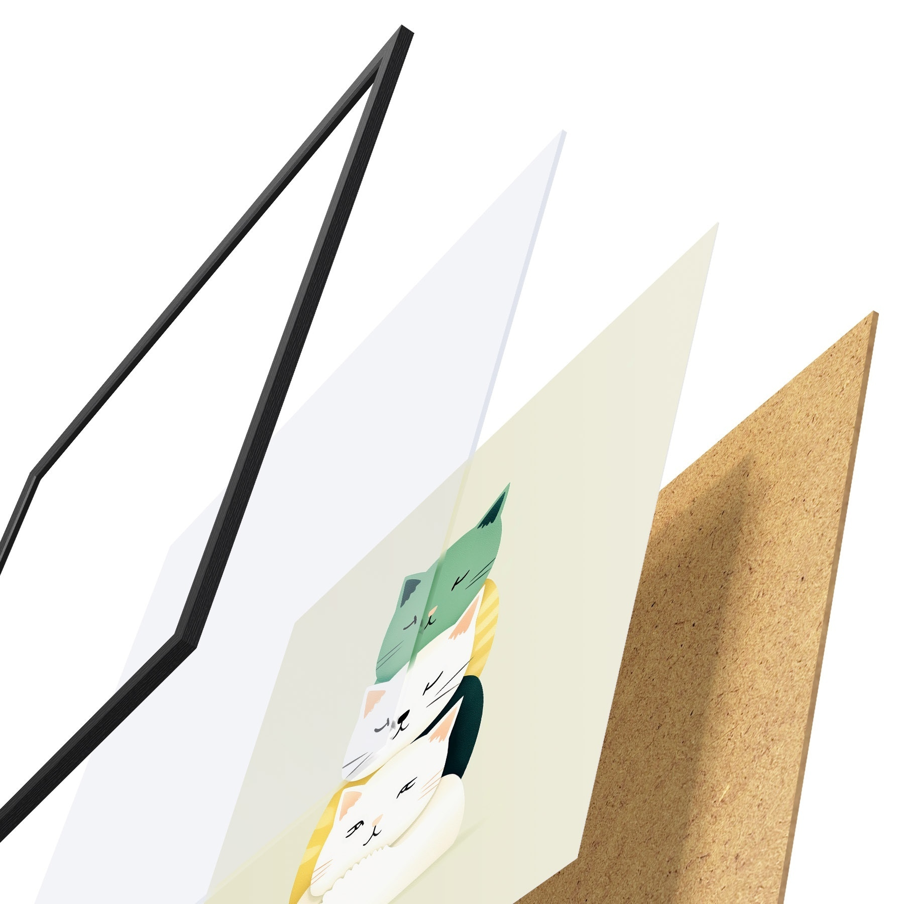 L’affiche encadrée est composée d’un cadre, d’un plexiglas, d’une image imprimée et d’un support en aggloméré. Elle est prête à être accrochée au mur grâce aux fixations situées à l’arrière.