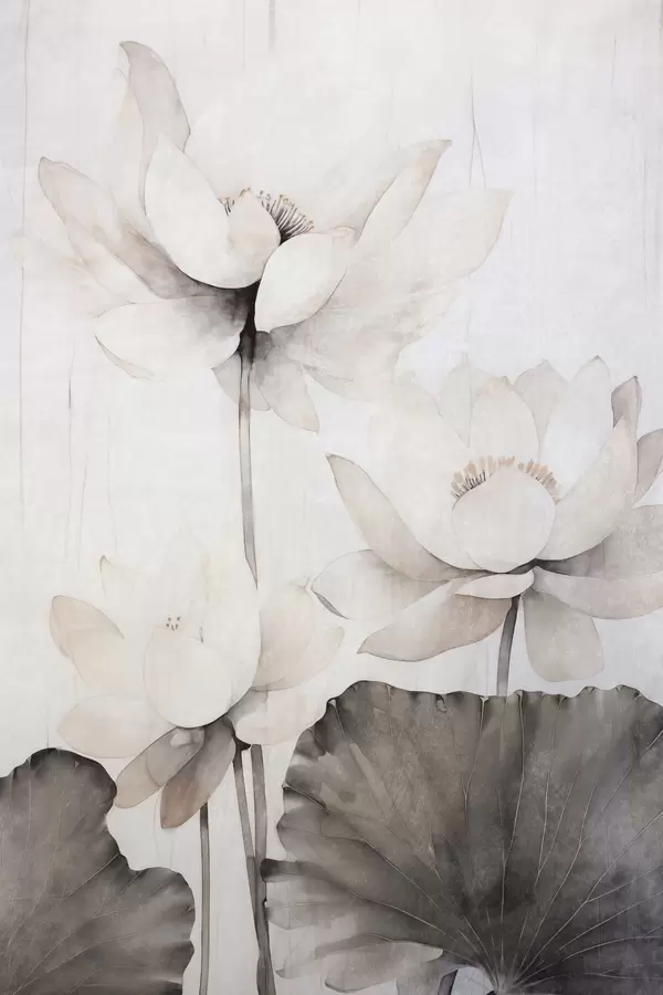 Poster Fleurs de lotus blanches texturées avec des feuilles foncées, fond clair, design minimaliste Nr f45936