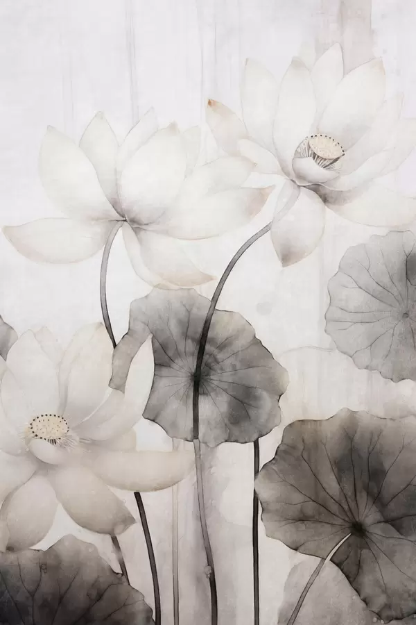 Poster Fleurs de lotus blanches texturées avec des feuilles foncées, fond clair, design minimaliste Nr f45937