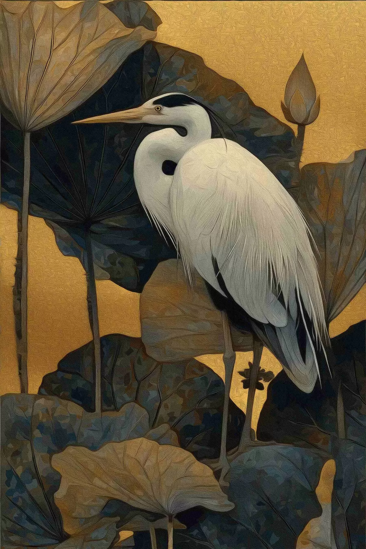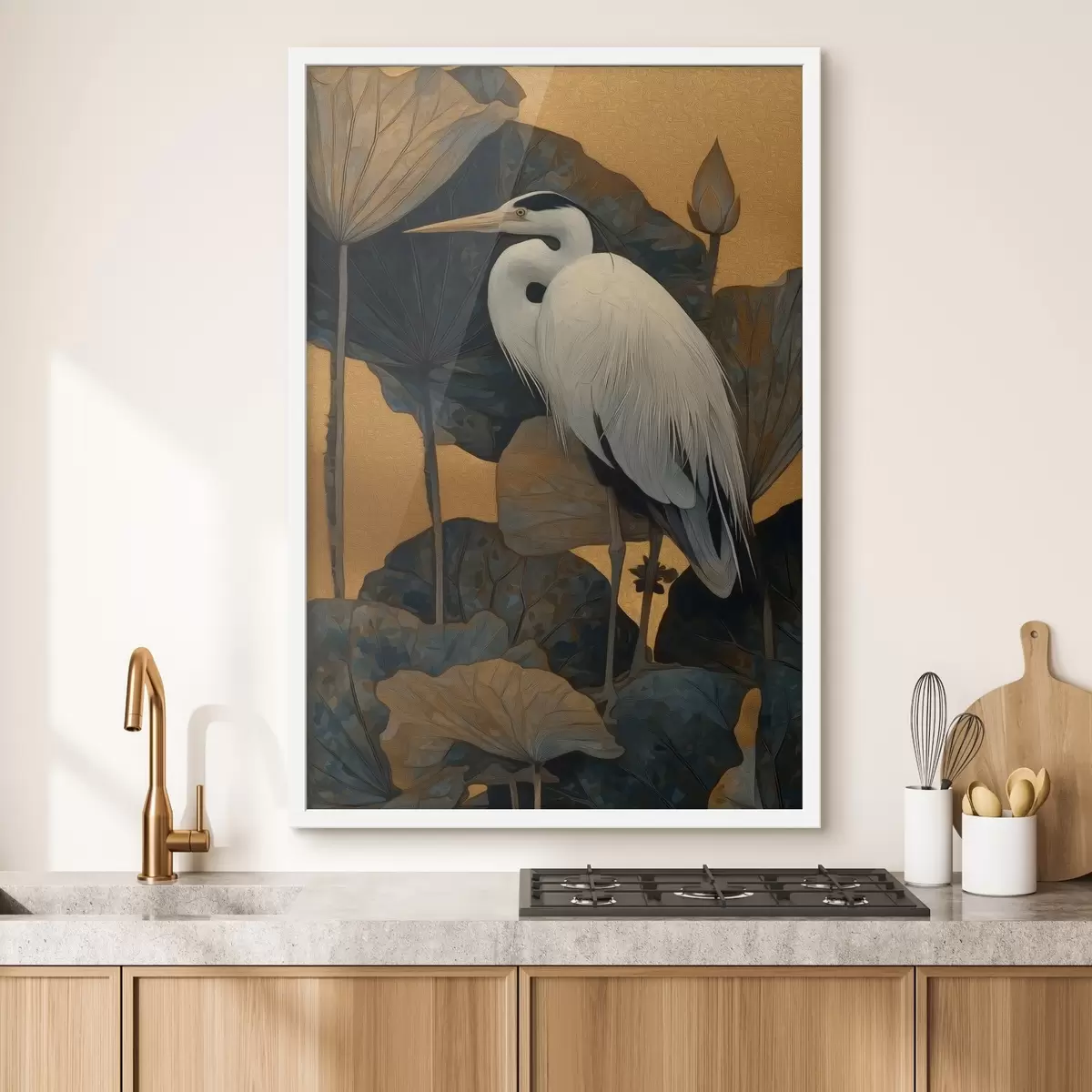 Poster Héron blanc parmi de grandes feuilles sur un fond chaud Nr f46147