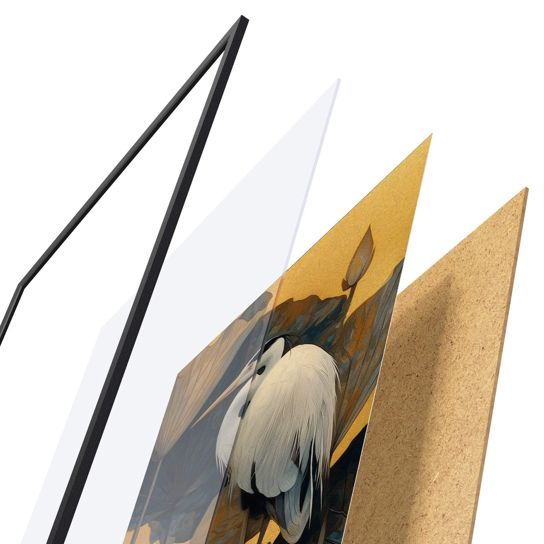 Poster Héron blanc parmi de grandes feuilles sur un fond chaud f46147
