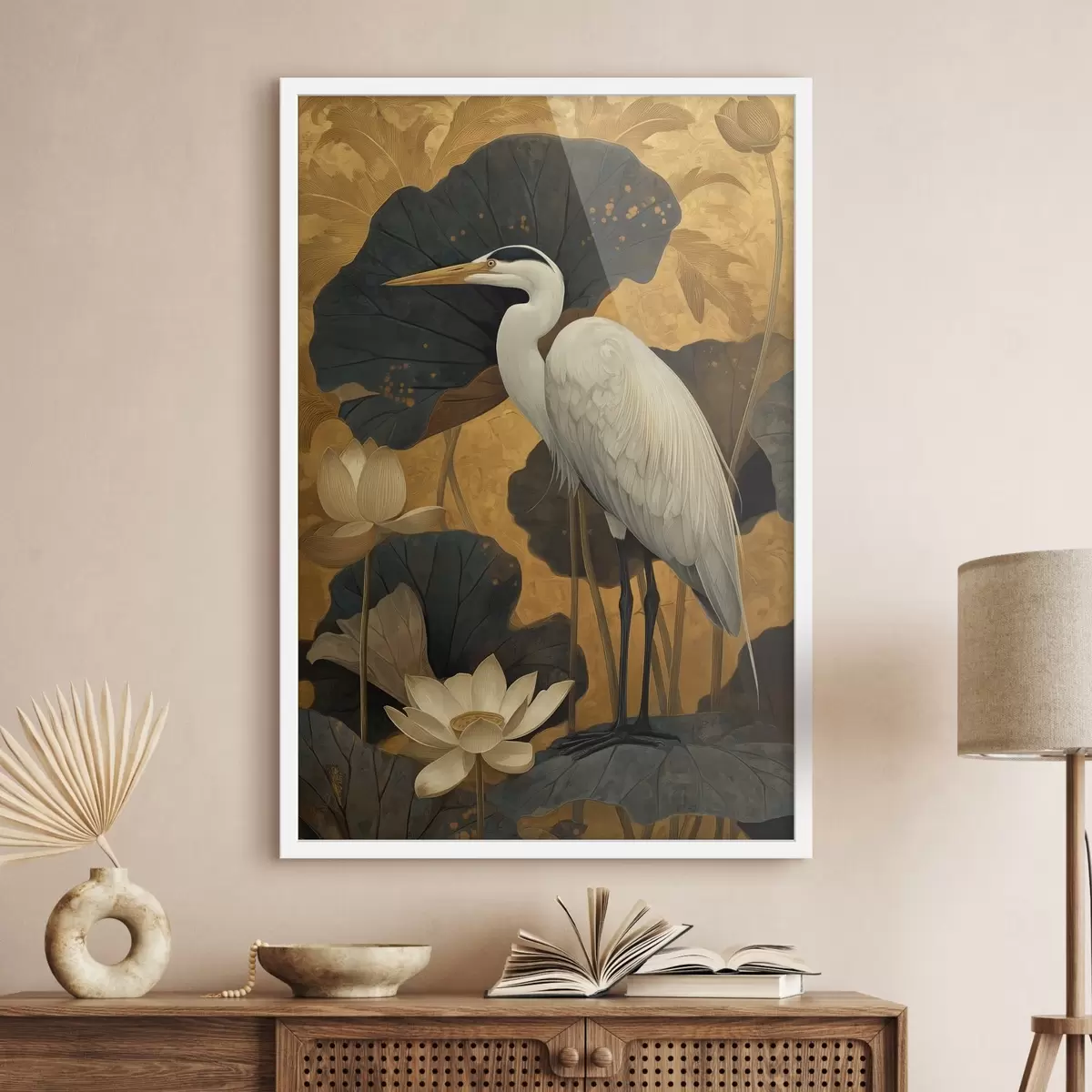 Poster Héron parmi les lotus sur un fond chaud Nr f46148