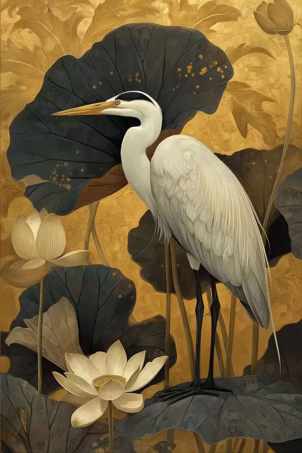 Poster Héron parmi les lotus sur un fond chaud Nr f46148