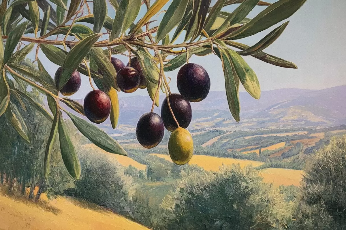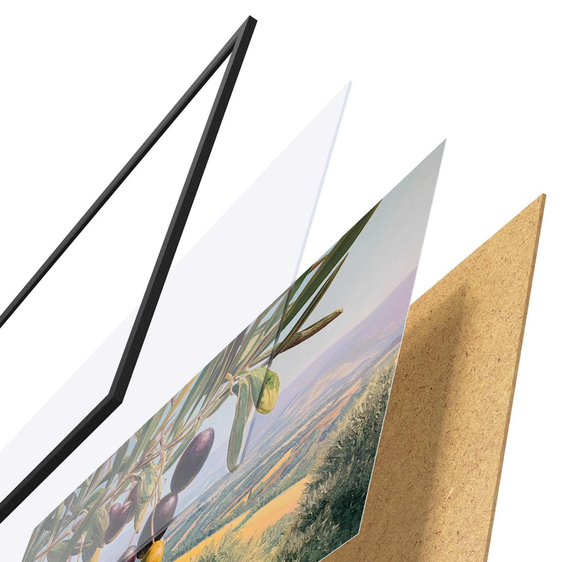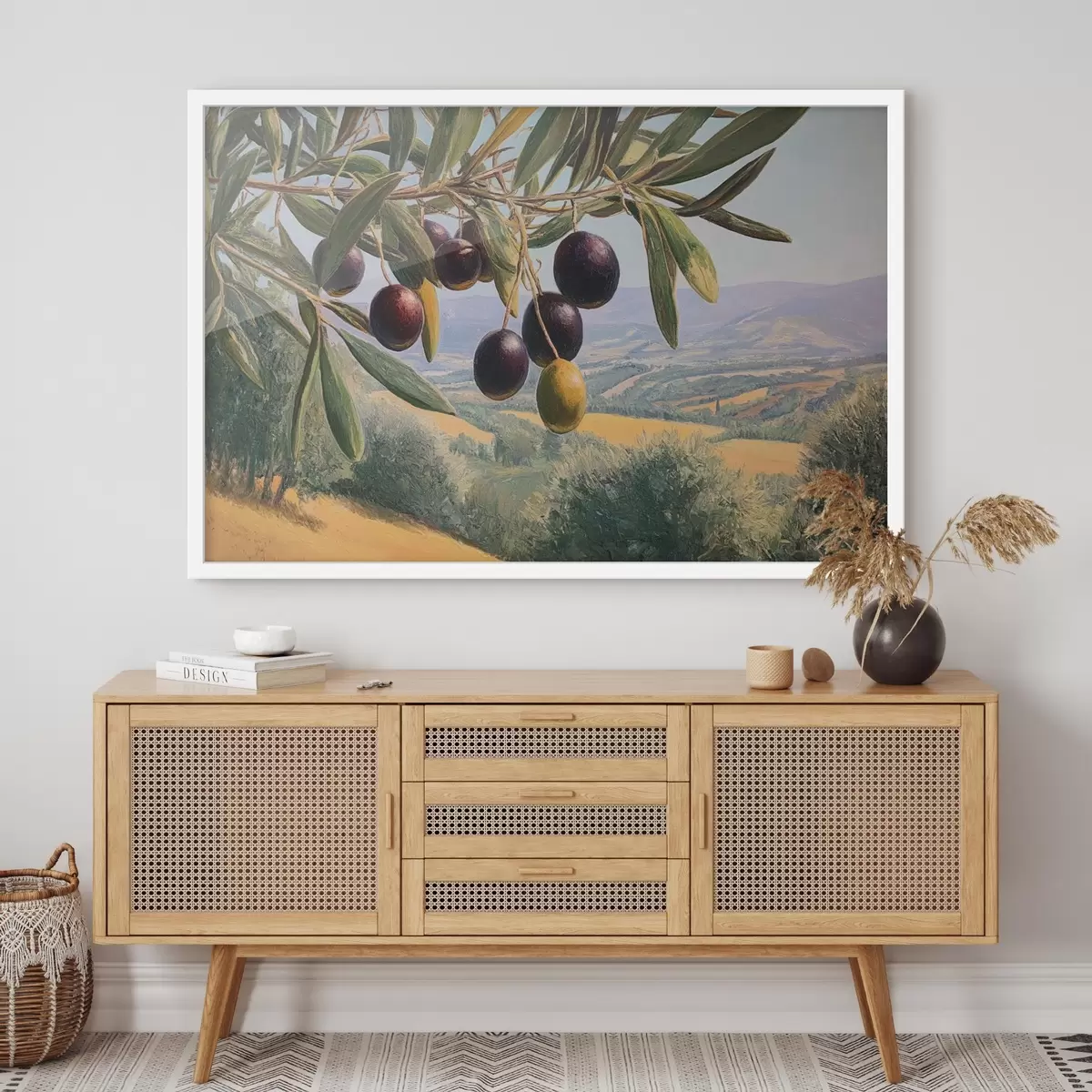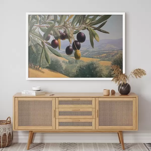 Poster Branche d'olivier avec des fruits noirs sur fond de paysage estival Nr f46150