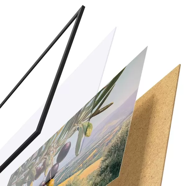 L’affiche encadrée est composée d’un cadre, d’un plexiglas, d’une image imprimée et d’un support en aggloméré. Elle est prête à être accrochée au mur grâce aux fixations situées à l’arrière.