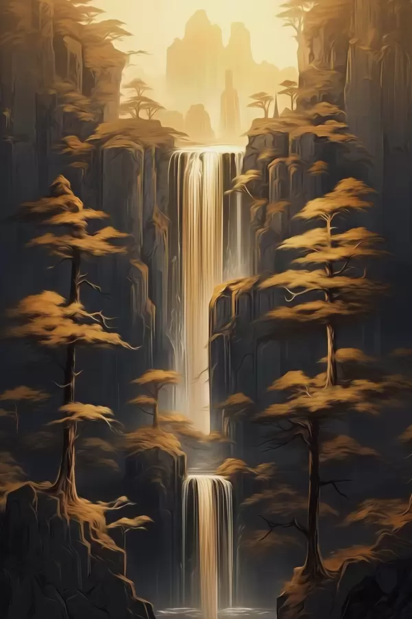 Poster Hautes falaises avec une cascade et des pins dans la lumière du soir Nr f46151