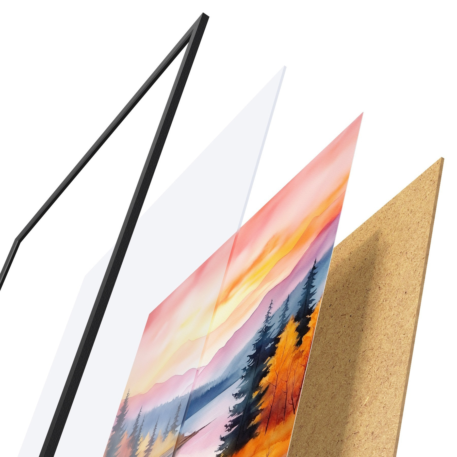 L’affiche encadrée est composée d’un cadre, d’un plexiglas, d’une image imprimée et d’un support en aggloméré. Elle est prête à être accrochée au mur grâce aux fixations situées à l’arrière.