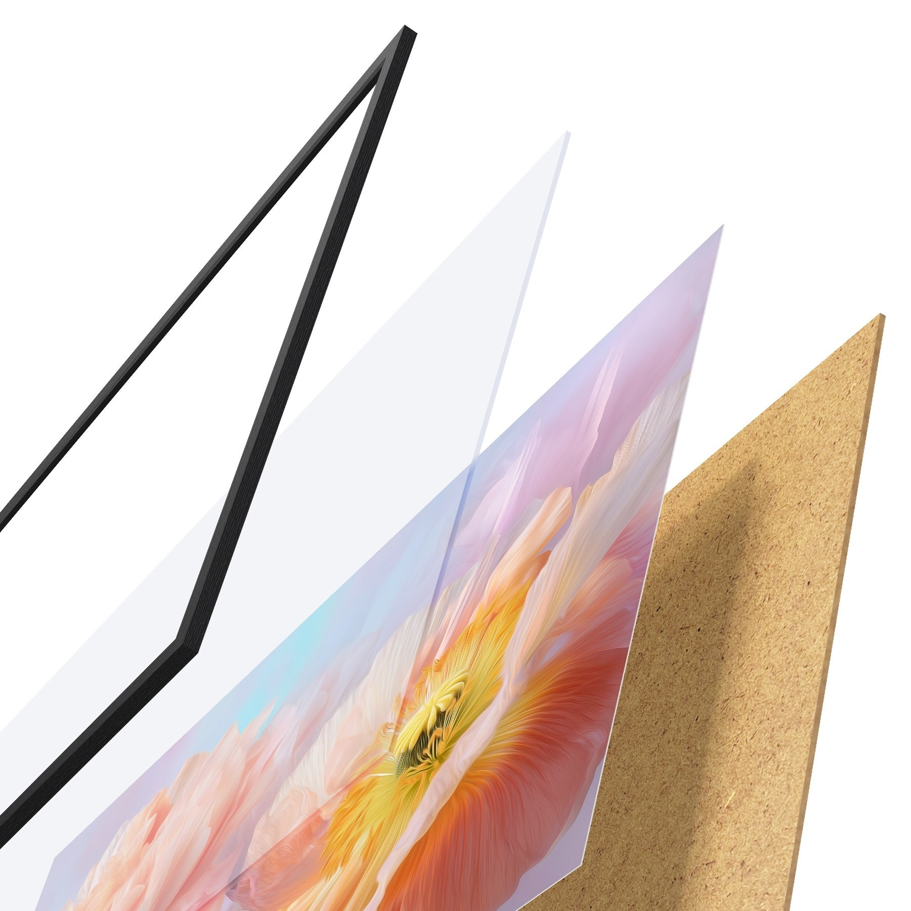 L’affiche encadrée est composée d’un cadre, d’un plexiglas, d’une image imprimée et d’un support en aggloméré. Elle est prête à être accrochée au mur grâce aux fixations situées à l’arrière.