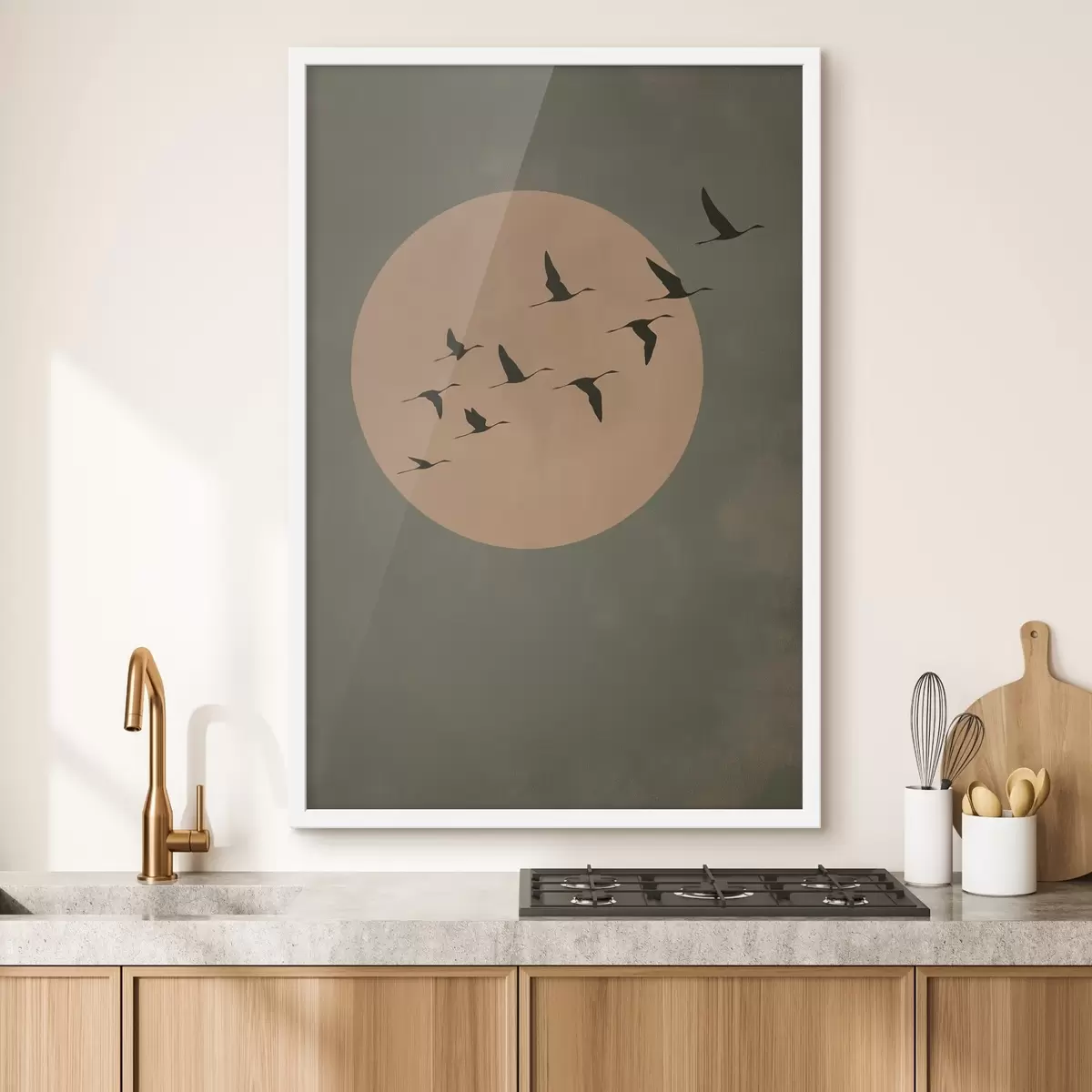 Poster Une volée d'oiseaux volant devant une grande lune chaude Nr f46162