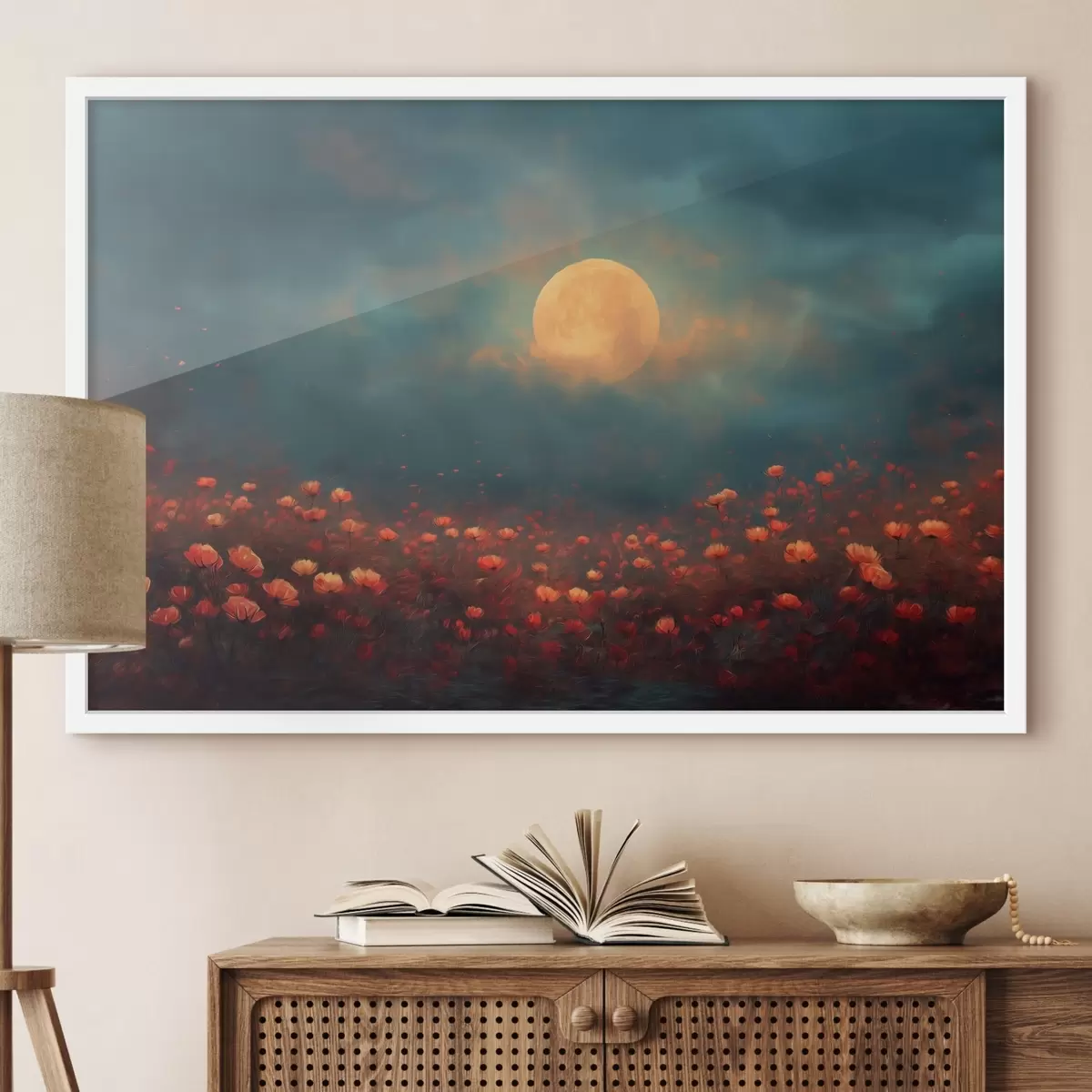 Poster Lune au-dessus d'un champ de fleurs rouges dans un ciel brumeux au crépuscule f46167