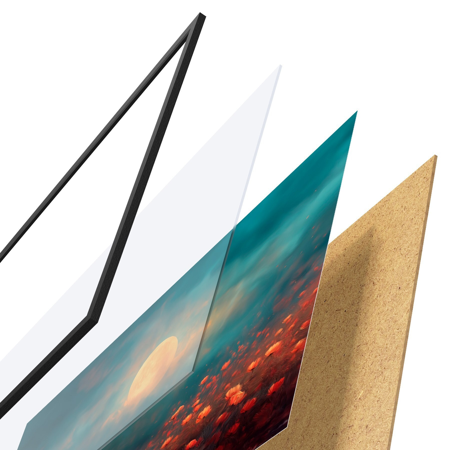 L’affiche encadrée est composée d’un cadre, d’un plexiglas, d’une image imprimée et d’un support en aggloméré. Elle est prête à être accrochée au mur grâce aux fixations situées à l’arrière.