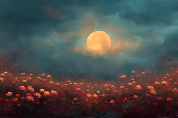 Poster Lune au-dessus d'un champ de fleurs rouges dans un ciel brumeux au crépuscule Nr f46167
