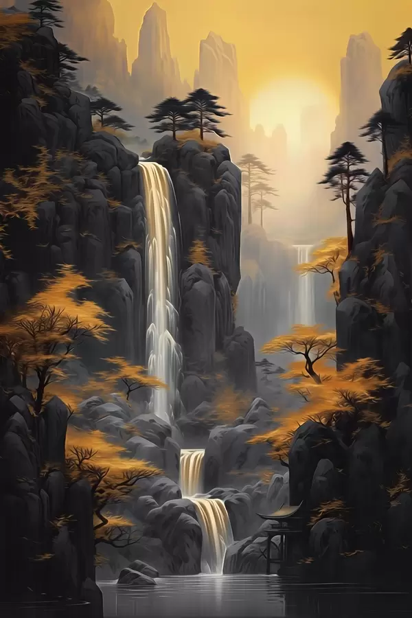 Poster Paysage rocheux avec une cascade dans les tons chauds du coucher de soleil Nr f46177