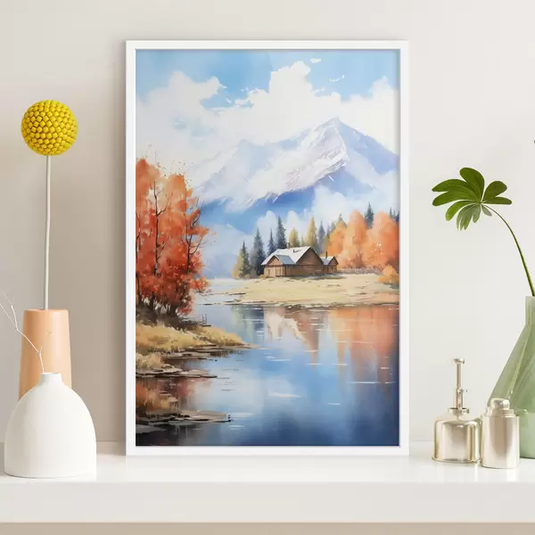 Poster Paysage automnal au bord d'un lac avec une maison et des montagnes Nr f46184