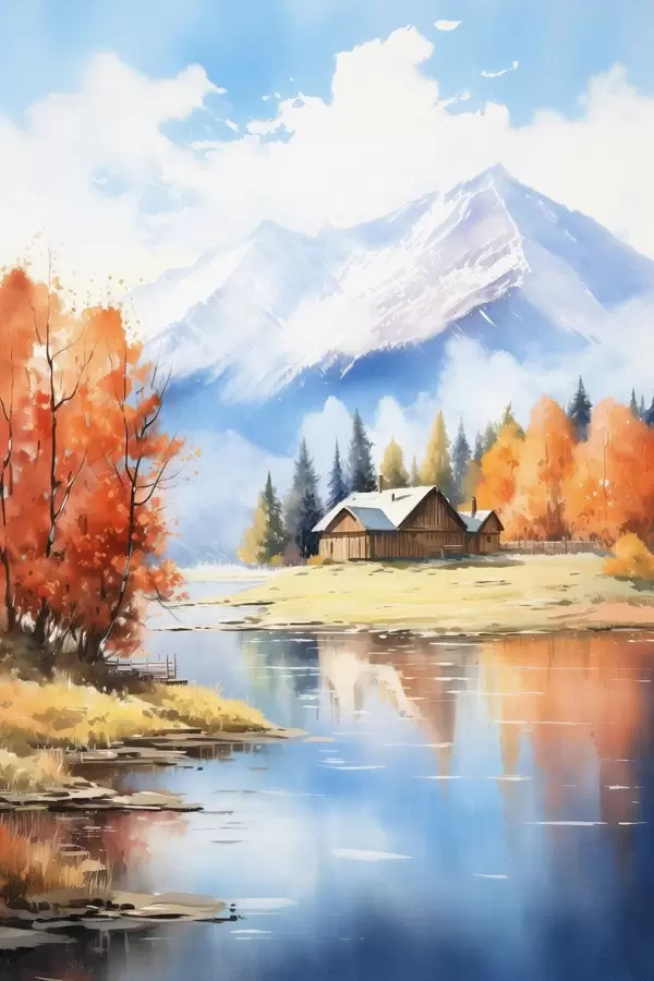 Poster Paysage automnal au bord d'un lac avec une maison et des montagnes f46184