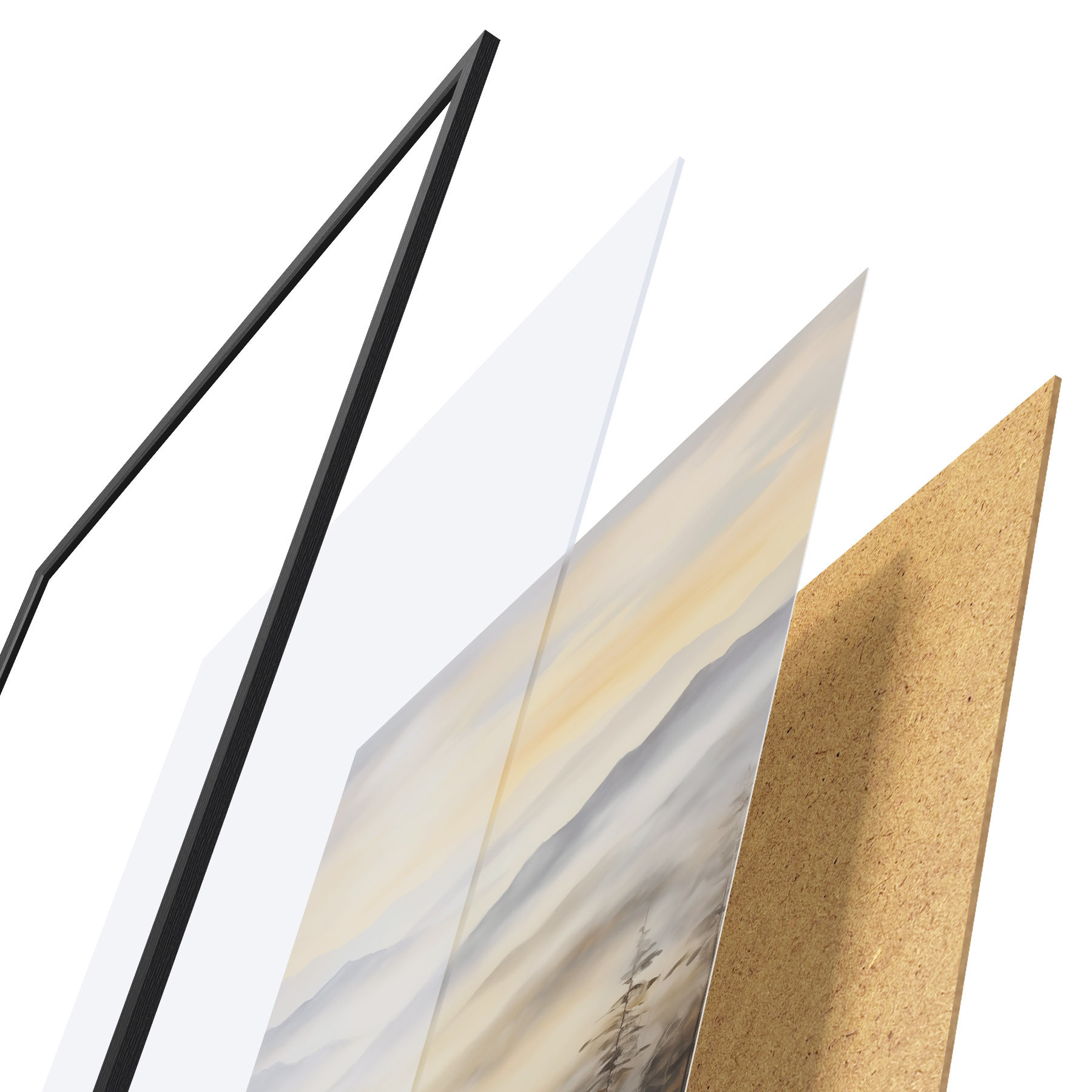 L’affiche encadrée est composée d’un cadre, d’un plexiglas, d’une image imprimée et d’un support en aggloméré. Elle est prête à être accrochée au mur grâce aux fixations situées à l’arrière.