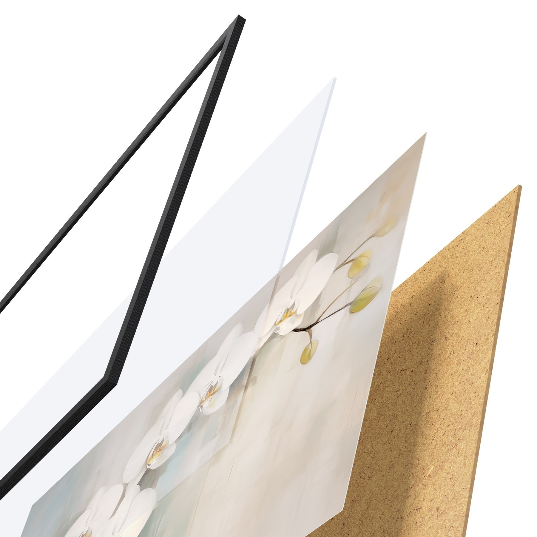 L’affiche encadrée est composée d’un cadre, d’un plexiglas, d’une image imprimée et d’un support en aggloméré. Elle est prête à être accrochée au mur grâce aux fixations situées à l’arrière.
